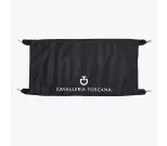 Tyylikäs Cavalleria Toscana -tallisuojus on valmistettu vettähylkivästä nailonista ja viimeistelty suurella painetulla logolla kontrastivärillä. Karabiinihakaset sivuilla mahdollistavat suojan kiinnittämisen karsinaan, jotta hevonen pysyy turvallisena ja suojattuna, vaikka karsina olisikin auki. Väri: musta.