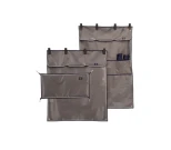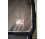 Beigenruskea karsinaverho hienoilla yksityiskohdilla. Hopea-, ruskea- ja sininen yksityiskohta reunassa. Yläosan hihnat voidaan kiinnittää karsinaan.