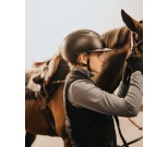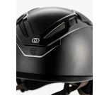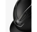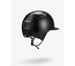 Kevyt ratsastuskypärä, joka on suunniteltu turvallisuutta ja muotoilua silmällä pitäen. Erittäin vahva kuori on valmistettu korkeateknologisista materiaaleista, kuten hiilikuidusta ja komposiittisesta termoplastihartsista. Kypärässä on tyylikäs ulkonäkö mattapintaisella mustalla pinnalla ja kromiyksityiskohdilla. Ruskea leukahihna pikasoljella lisää turvallisuutta. Leveä lippa.
