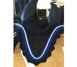 En marinblå huva för fullstor häst. Kanten enkelt broderad. Passpoaler i klassiskt klarblått och vitt representerar på ett diskret sätt de finska färgerna. Passar för både dressyr och hoppning.