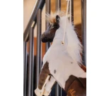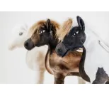 Ett litet rep sitter fast i leksakens nacke så att den enkelt kan hängas upp i boxen. Eftersom leksaken är avsedd för mycket lek och skoj kan det hända att din häst biter sönder den. Den är fylld med jute, vilket gör att både halsen och huvudet kan tryckas in utan att tappa formen.