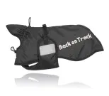 Svart hundtäcke i polyester. Vattenavstötande, material som andas. Keramiskt fodertyg. Reflex på magbältet och sidorna. Framtill möjlighet att spänna. Öppning i nacken för koppel, samt öppning med dragkedja för svans.