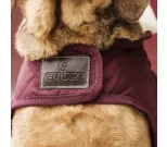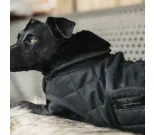 The dog coat can be closed with hook and loop closures on the chest and belly. The closures are finished off with artificial leather patches. The hood can be folded back over the neck for extra cover