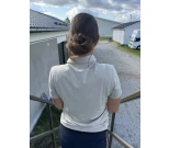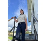 Denna kortärmade pikeblus för damer är beige med dekorationer i marinblått. Skärningen ypperlig, materialet tekniskt. Lämpar sig lika bra utanför stallsmiljö som i stallet eller på golfabanan.