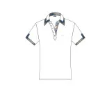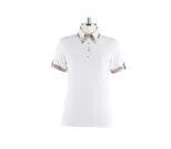 En fräsch pikeblus i vitt med kort ärm. På kragen och ärmarna detaljer i rosa/röd eller safirblått. Materialet är bästa bomull. I denna blus trivs du lika bra i stallet som på golfbanan.