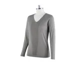 En tunn tröja med V ringad halsöppning för damer. Färgen är ljusgrå, och mönstret ger ytan liv.