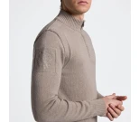 Neuleessa on korkea kaulus ja edessä half-zip -vetoketju, sileä neulos sekä kontrastiväriset käännetyt neulosyksityiskohdat olkapäillä. Joustavat ribbiresorit helmassa, hihansuissa ja kauluksessa varmistavat napakan istuvuuden.